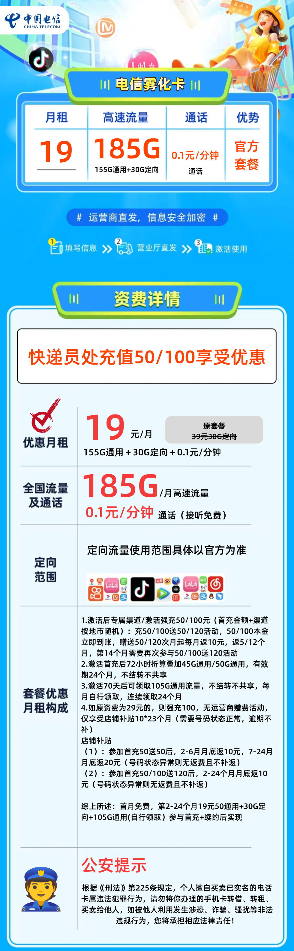 卖点: 两年19 专属渠道充值50/100 部分流量70天后到账